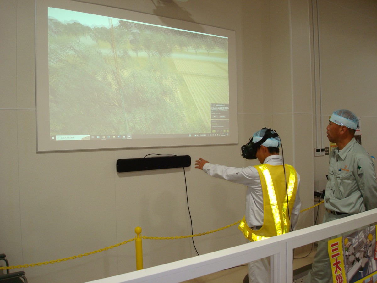 ⼆本松実業⾼等学校都市システム科の2年⽣3名が、実際の⼯事現場を⾒学し、測量したり重機の操作説明を聞いたりしたほか、当社の危険体感実技センターでは、バーチャルリアリティ技術を活⽤しCGで再現した重機との挟まれの衝撃感覚を疑似体験して頂きました。