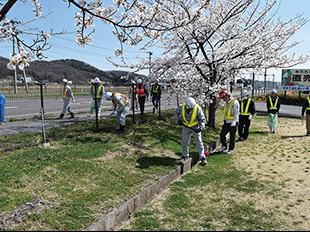 社会・地域貢献活動の一環として4月5日、あだたらの里直売所・ふれあい広場周辺の美化活動を行いました。当日は当社社員、協力会社併せて計14名が参加しました。地域のご協力に感謝し、ふれあい広場の内側と周囲の国道4号線沿い歩道などを対象に紙くずやペットボトル、ビニール類のゴミを分別しながら回収するなど熱心に取り組みました。