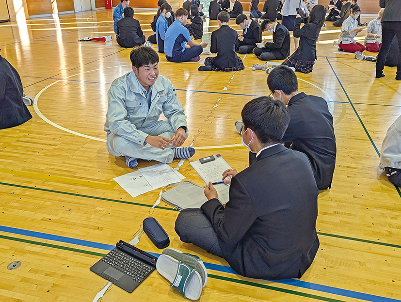 2024年10月15日、二本松実業高校の初の試みとして、一年生による「職業インタビュー」が行われ、生徒141名、当社を含む38社が参加しました。対象となった企業は、同校の卒業生の就職した会社や、入社5年末満の若手社員などで、当社からは入社3年目日つ同校卒業生の桂澤健斗土木本部工事課技士補が参加しました。生徒達は3〜4人のグループに分かれ、働くとはどういうことか、どのように会社を選んだのか、具体的な仕事内容や、やりがいや苦労していることなどをそれぞれインタビューし、現場の生の声に大きな刺激を受けていました。