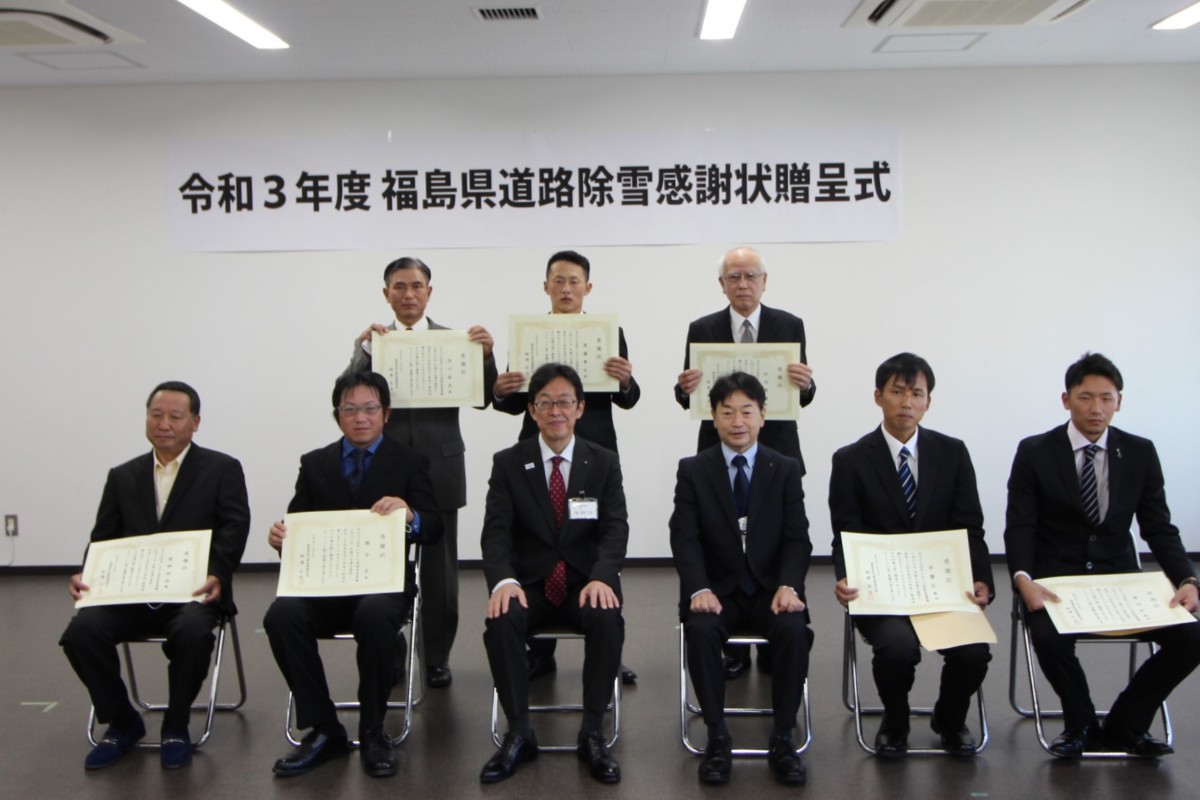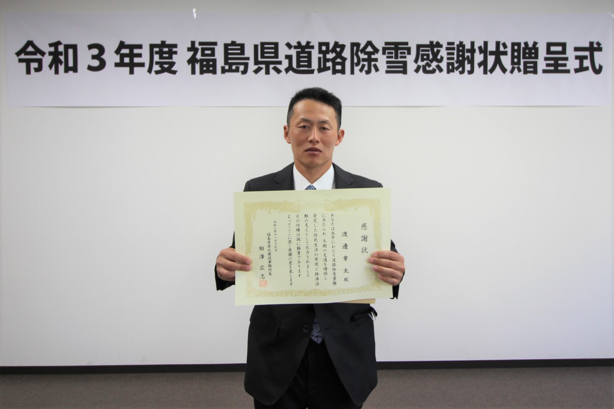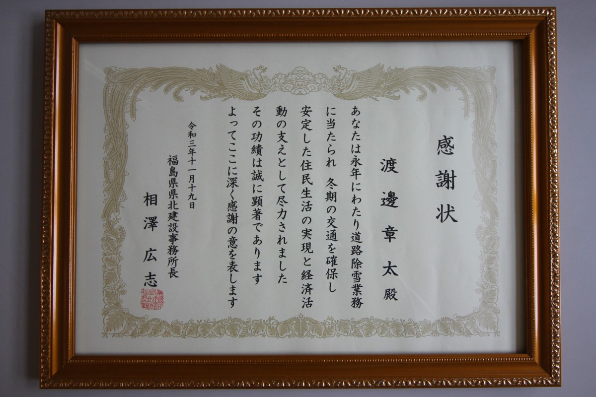 11月19日福島県県北建設事務所にて、今年度道路除雪感謝状贈呈式が行われました。 冬の厳しい業務環境のなかで、永年にわたり現場の最前線で除雪業務に献身的に取り組んでいる社員に対し、 これまでの除雪業務への苦労と社会的貢献に敬意を表するため、相澤広志同建設事務所⻑より、感謝状が授与されました。 当社では、土木本部工事機材課 渡邊章太氏が受賞しました。
