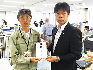 熊本城総合事務所 河田日出男所長(左)へ義援金を手渡する当社菅野社長(右)
