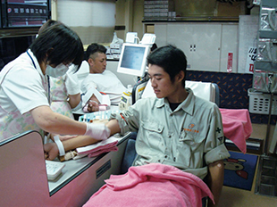 昨年10月3日、本社駐車場において同年2回目となる献血活動が実施されました。 今回も仕事の合間を縫って当社社員をはじめ、関係協力会社のご協力をいただき、約60名から貴重な善意が寄せられました。