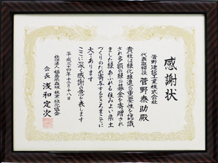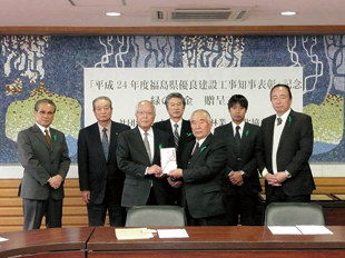 平成24 年度福島県優良建設工事知事表彰を記念して、当社を含む受賞者の有志15 社が、(社) 福島県森林・林業・緑化協会に緑の募金を寄贈しました。ふくしま中町会館で行われた贈呈式では当社の菅野社長も出席し、有志代表の馬場富男東邦土建工業社長から(社)福島県森林・林業・緑化協会の斎藤卓夫副会長に目録が贈呈され、浄財を寄せた各社に斎藤副会長から感謝状が贈られました。