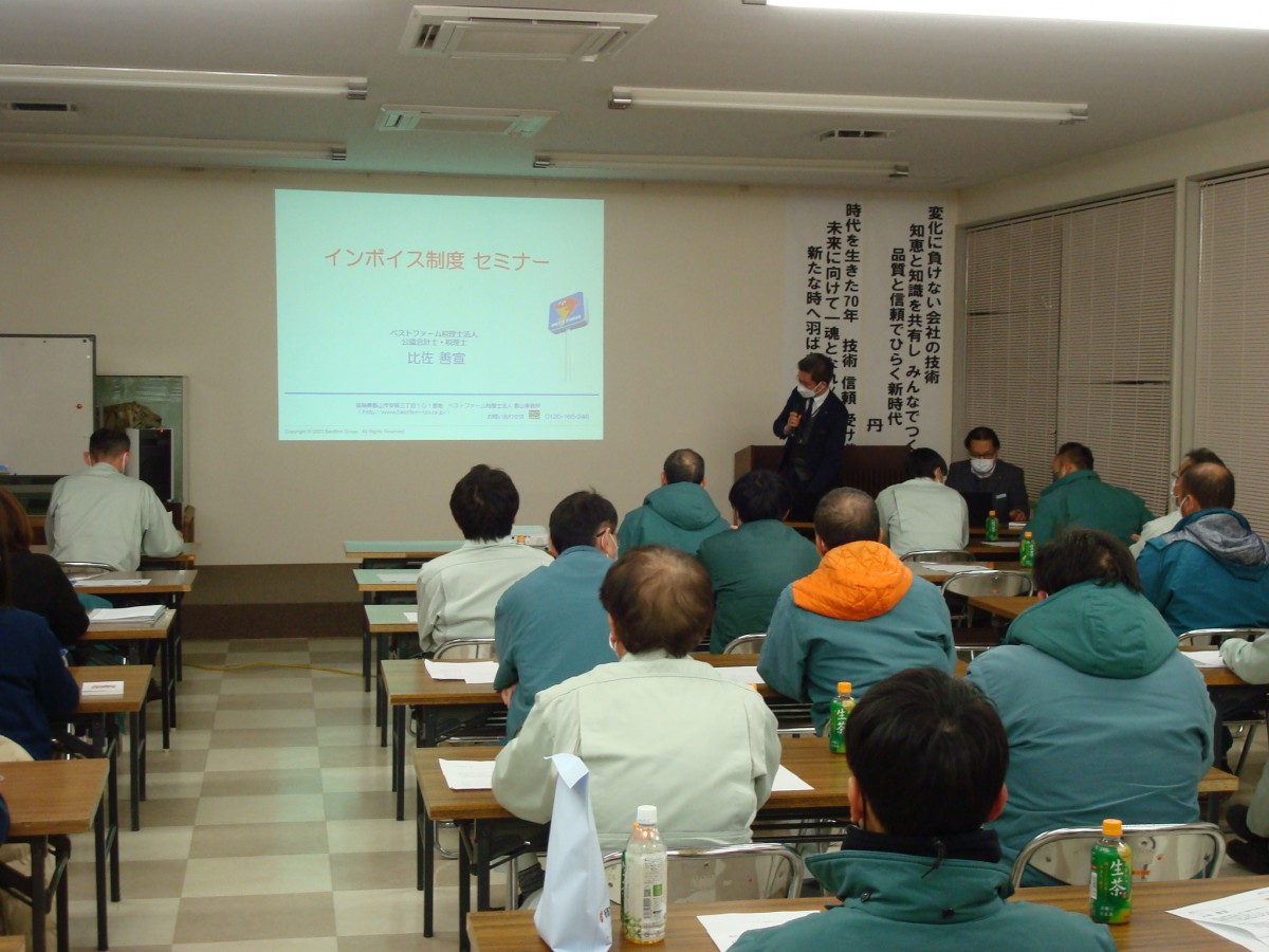 2⽉3⽇、本社多⽬的ホールにて「インボイス制度」セミナーが開催されました。令和5年10⽉1⽇からインボイス制度(適格請求書等保存⽅式)が開始されることから、当社の顧問税理⼠であるベストファーム税理⼠法⼈ ⽐佐善宣様と五⼗嵐智和様によるセミナーを開催しました。役員及び社員40名が出席し、熱⼼に説明を聞いていました。