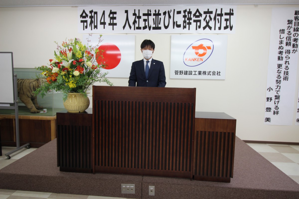 4月1日、当社多目的ホールにて令和4年度の入社式・辞令交付式が行われました。今年度は新卒者8名 (浅野正太氏、佐藤丞氏、小林良吉氏、桂澤健斗氏、松井海翔氏、櫻田大翔氏、高橋龍生氏、花岡利輝氏) が入社しました。 また、新年度職位改定に伴い、建築本部、土木本部から10名が新管理職、職位変更として辞令が交付されました