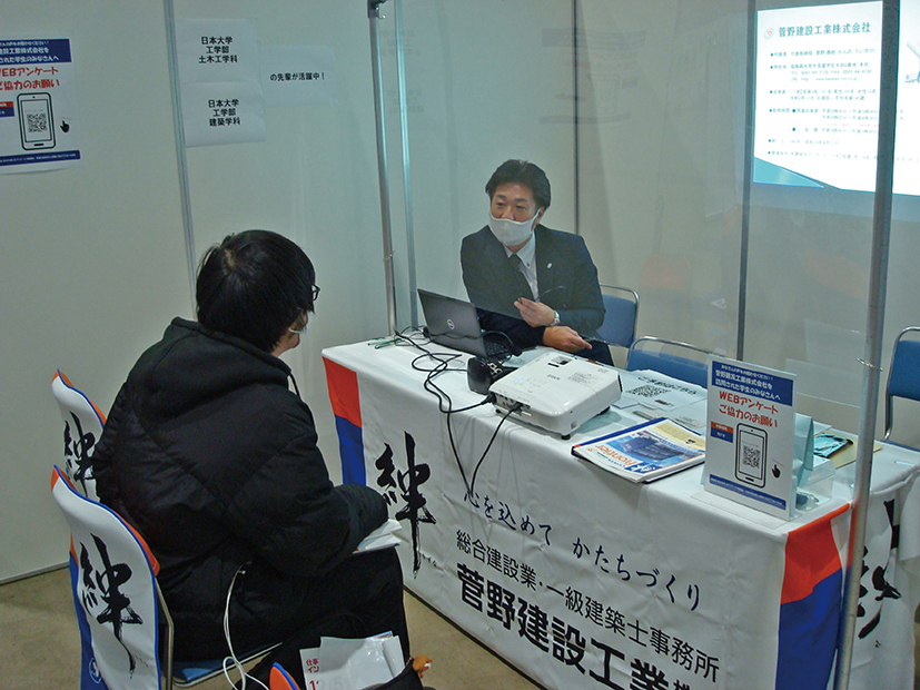 昨年12月5日にビッグパレットふくしまにて、令和5年3月卒業予定新卒者を対象としたマイナビ仕事研究&インターシップフェアが開催されました。当社のブースを訪れた学生が熱心に説明を聞いていました。今後も企業説明会に県内外を問わず積極的に参加し、新たなる人材確保に取り組んでまいります。