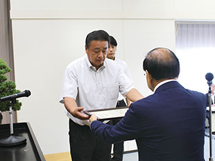 8月27日、今年度の二本松市優良建設工事表彰式が、二本松市市役所正庁で行われました。式には各受賞会社の代表者をはじめ、現場代理人、来賓など約30名が出席し、9社が受賞・表彰されました。当社関連企業の有限会社アンサードが昨年施工した「越田・塔ノ木線道路改良工事」が土木工事部門で受賞し、有限会社アンサードの會田幸由社長は、三保恵一市長より表彰状と記念の盾が贈られ、工事の取り組みと高い施工技術を讃えられました。その後、各社代表者が謝辞を述べ、受賞の栄誉に恥じない業務と一層の技術向上に努めることを誓いました。
