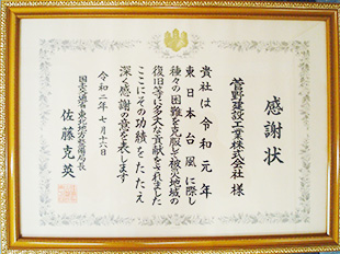 令和元年10月の台風19号に伴う大雨による浸水で被災した複数の箇所(釜沼樋門外)において、内水排除及び緊急河川巡視を実施したことによる災害対策功労者として国土交通省東北地方整備局、佐藤克英局長より感謝状をいただきました。佐藤局長からは「令和元年に発生した東日本台風をはじめとする自然災害に察し、厳しい現場条件などの困難を克服し、早期の復旧等してくださった」と感謝の言葉をいただきました。