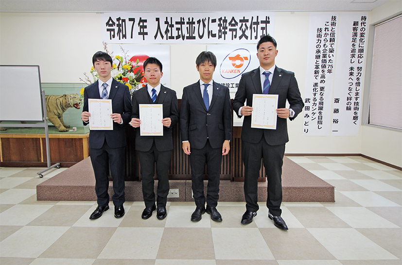 令和7年4月1日、当社多目的ホールにて令和7年度の入社式・辞令交付式が行われました。