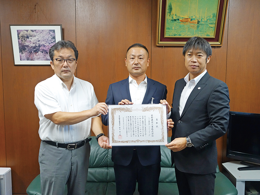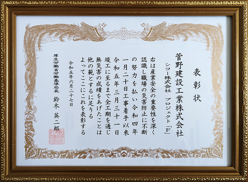 工期期間内において無災害であったことを受け、7月6日、シコー株式会社 プロジェクト「F」について、福島労働基準監督署 塩原哲朗署長より表彰されました。 現場では、工事安全事前検討会を行い、危険箇所の洗い出しや対策の検討に努め、積極的にリスク低減活動を実施したことが安全意識の向上に繋がりました。