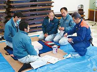 通報、避難誘導訓練においては、当社自衛消防隊隊長の菅野泰蔵氏の指揮のもと、社員の誘導を迅速に行うと共に、AED及び心肺蘇生の訓練を行いました。