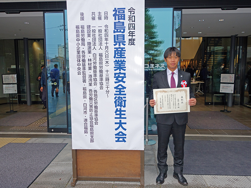 令和4年10月6日、白河文化交流館コミネスにおいて、一般社団法人福島県労働基準協会主催の「令和4年度福島県産業安全衛生大会」が開催され、当社の安全管理への取り組みが表彰されました。評価の対象となったのは、2018年に当社敷地内に開設した「危険体感実技センター」です。建設産業の労働災書低減を目受賞会場にて目指し、業種を問わず誰でも利用でき、現場で起こり得る事故・災害につながる様々な状況を、実際に疑似体験することが可能です。現在まで社内外1,332名の研修を実施しています。