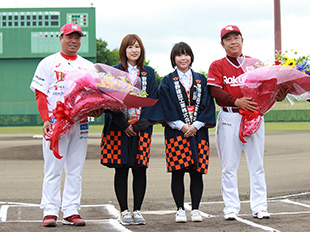 左から福島ホープスの岩村明憲監督、当社石川愛華氏、佐藤恵氏、東北楽天ゴールデンイーグルスの立石充男監督