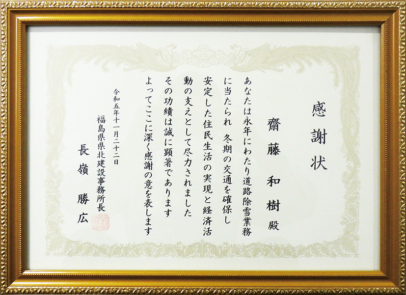 11月18日福島県県北建設事務所にて、今年度除雪感謝状贈呈式が行われました。冬の厳しい業務環境のなかで、永年にわたり現場の最前線で除雪業務に献身的に取り組んでいる社員に対し、これまでの除雪業務への苦労と社会的貢献に敬意を表するため、長嶺勝広同建設事務所長より、感謝状が授与されました。 当社では、土木本部工事機材課 齋藤和樹氏が受賞しました。