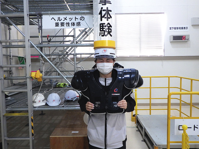 センター内の様々な設備を用いて、VR技術を活用しCGで再現した①重機の横転、②壁と重機に挟まれる衝撃感覚を疑似体験したり、滑り・転倒・脚立作業、安全帯ぶら下がり、墜落・転倒・落下体験など、現場で起こりうる労働災害の危険を直に体感した上で、危険回避のポイントや具体策などを確認しました。
