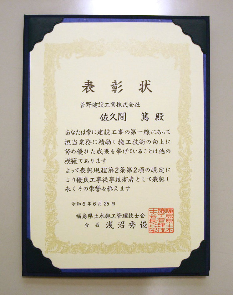 現場代理人の佐久間篤氏が福島県土木施工管理技士会会長表彰を受けました。
