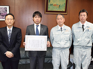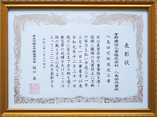 工期期間内において無災害であったことを受け、2月26日、「八島田宅地造成工事」について、福島労働基準準監督署 水野秀二署長より表彰されました。現場では、工事安全事前検討会を行い、危険箇所の洗い出しや対策の検討に務め、積極的にリスク低減活動を実施したことが安全意識の向上につながりました。今後も基本となる安全施工サイクルの徹底に努めてまいります。