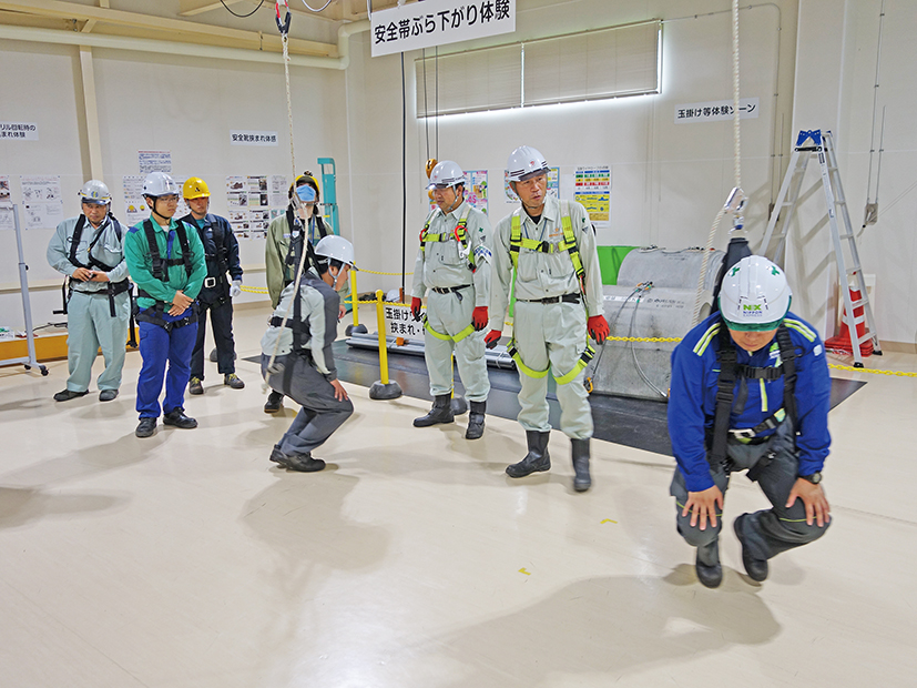 令和7年6月~10月にかけて労働災害防止のための研修会を、当社の危険体感実技センターで開催いたしました。研修会には、当社全社員(新入社員を含む)及びアンサード社員をはじめ二本松実業高等学校様、新地発電所安全衛生推進協議会様、その他の企業の方々合計173名が参加しました。センター内の様々な設備を用いて、滑り・転倒・脚立作業、安全帯のぶら下がり、壁落・飛来・落下体験など、現場で起こりうる労働災害の危険を直に体感した上で、危険回避のポイントや具体策などを確認しました。